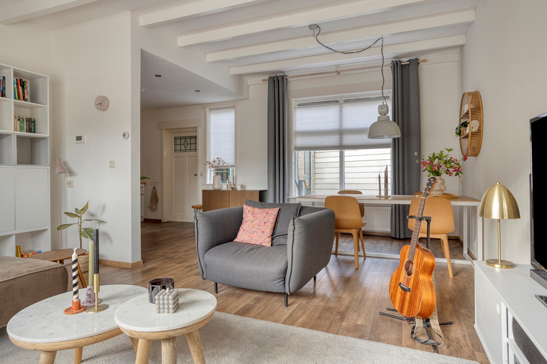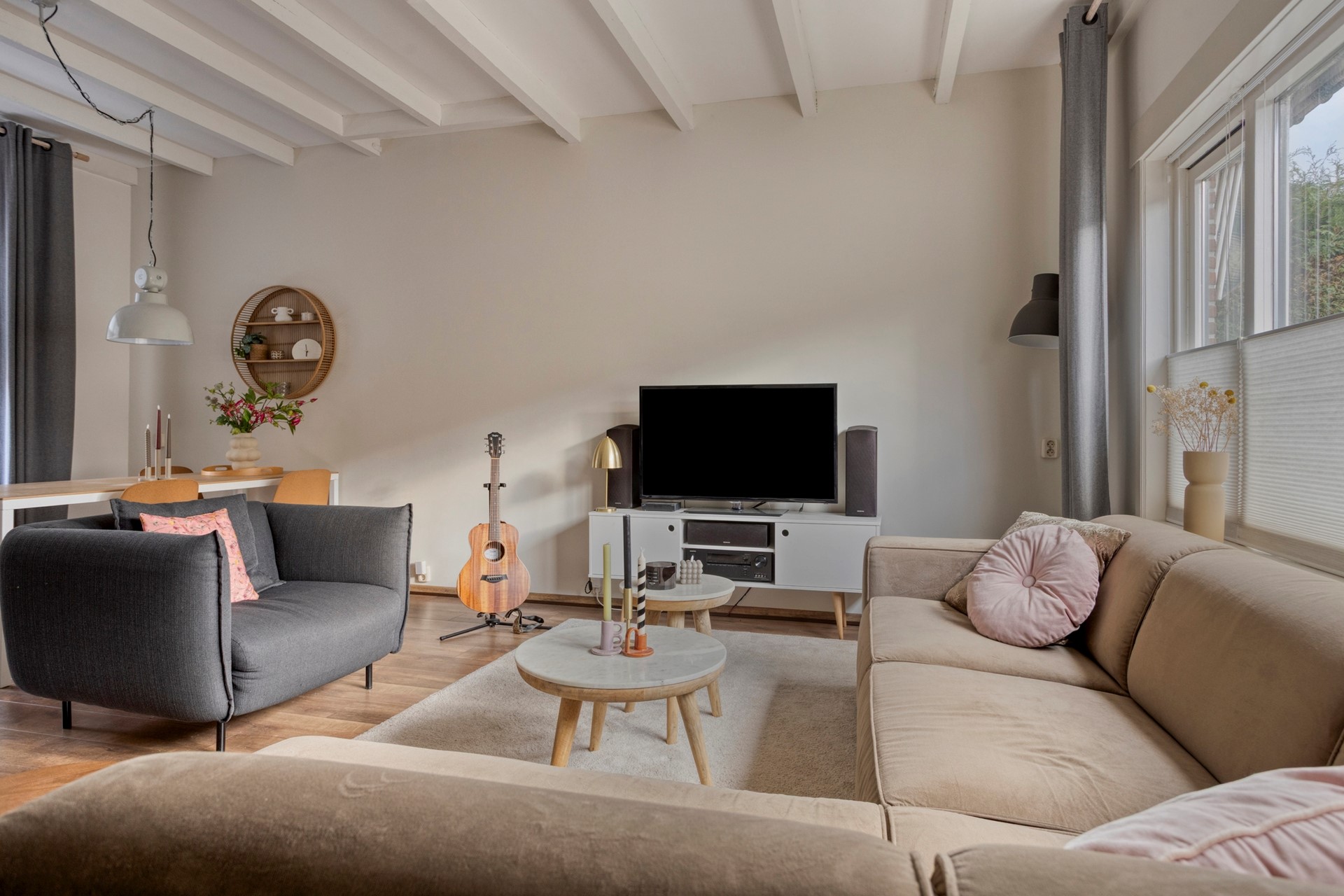 * Lichte L-vormige woonkamer (ca. 30 m²) met moderne laminaatvloer, vloerverwarming, balkenplafond en strak stucwerk