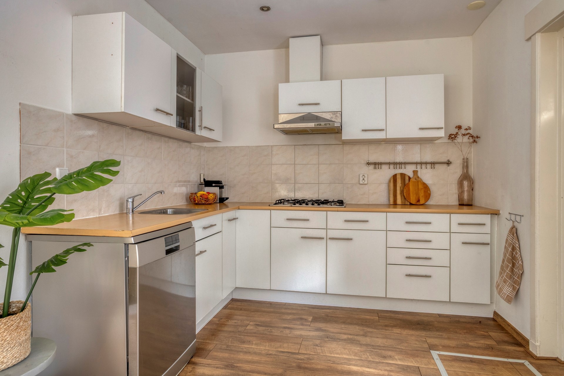 * Open keuken (ca. 9 m²) in hoekopstelling, voorzien van 5-pits kookplaat, afzuigkap en vaatwasser