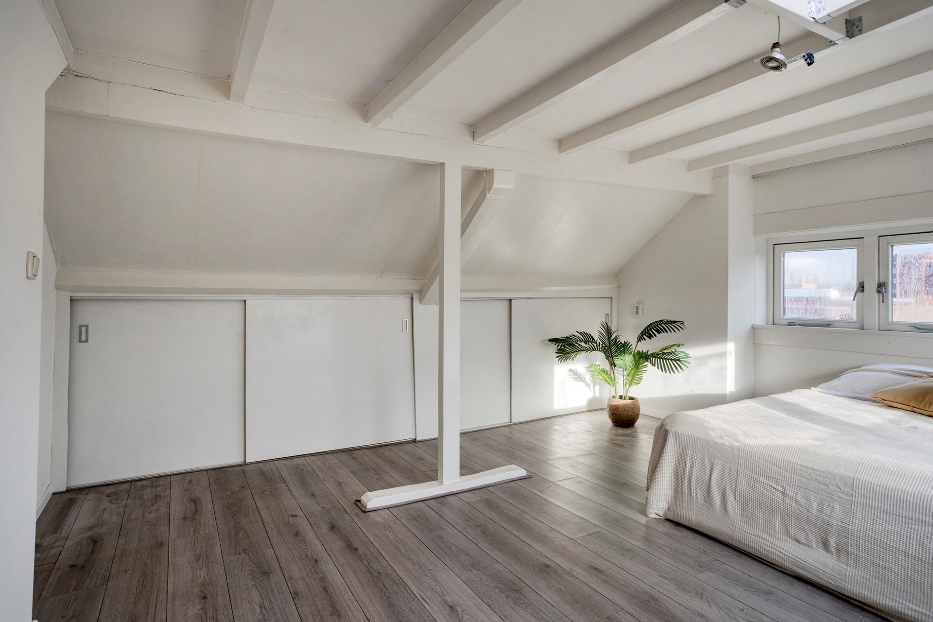 * Ruime derde slaapkamer (ca. 17,5 m²) met laminaatvloer, praktische berging achter de knieschotten en een grote lichtkoepel voor extra daglicht
